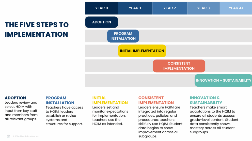 Rivet Education’s Instructional Materials Implementation Tool serves as a roadmap for the five phases of HQIM implementation. It is the foundation for the data submitted and displayed in the [Client] Implementation Dashboard. The tool outlines the key actions and corresponding success criteria that school system leadership, school leadership, and teachers need to navigate each phase successfully.